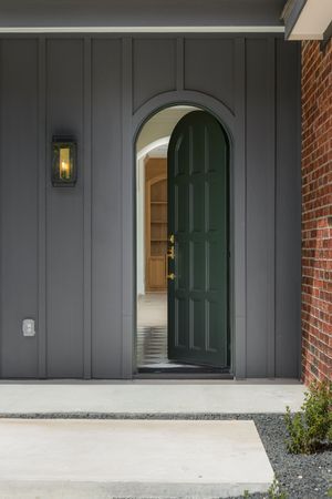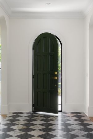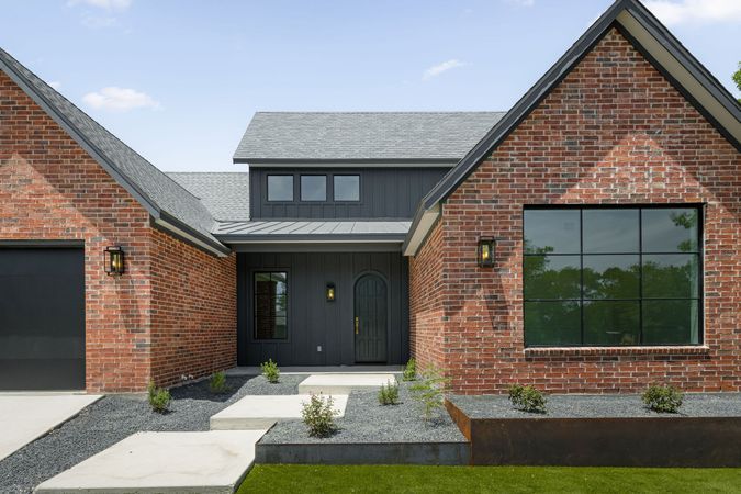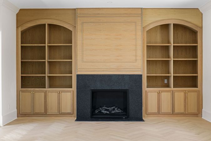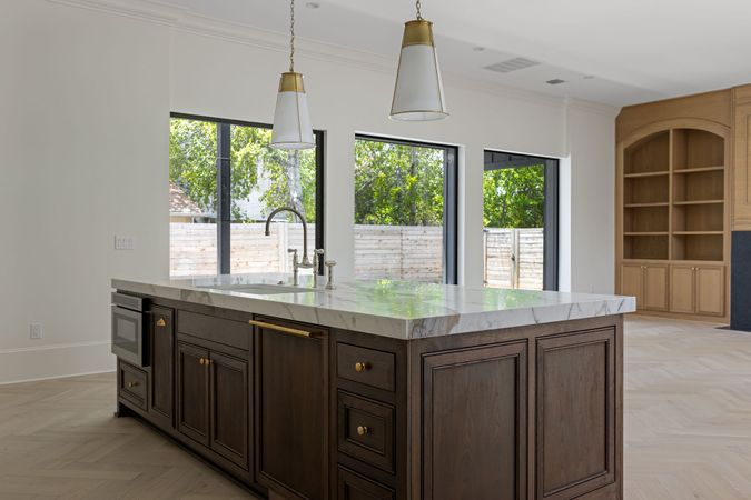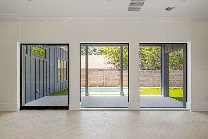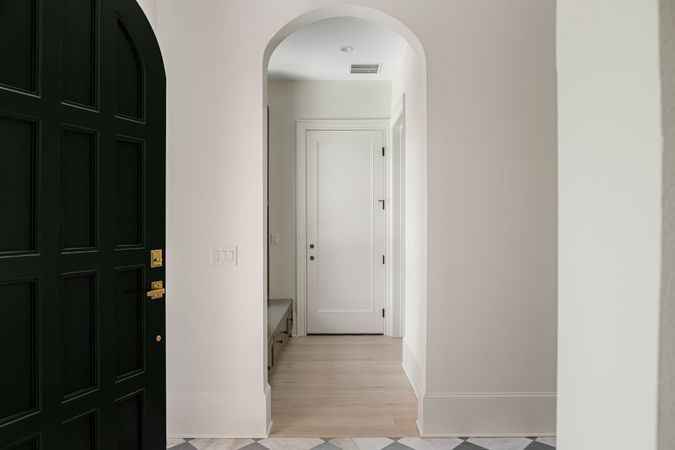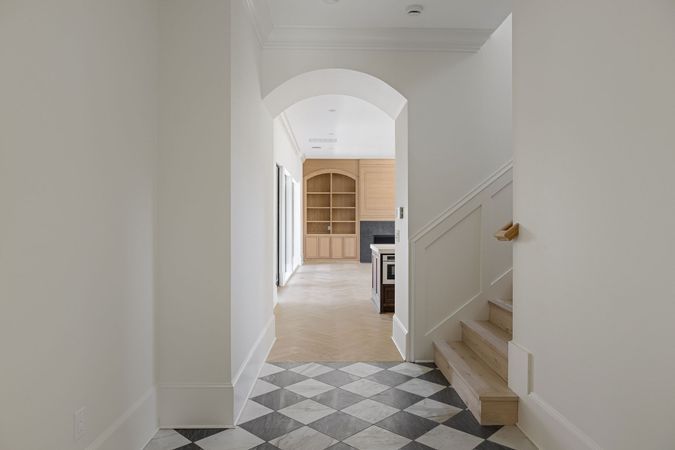 Bold and architectural from the outside, the home opens into an interior that feels airy and elegant. Soaring ceilings, graceful arches, and oversized RAM windows flood the space with natural light yet maintain privacy from neighbors. Classic herringbone-patterned white oak floors and a gas fireplace add warmth and texture, while sculptural lighting—like the iconic Franca chandelier—casts a soft glow that sets the tone for gatherings and connection.