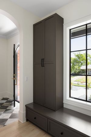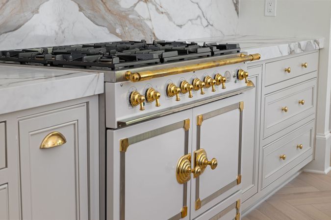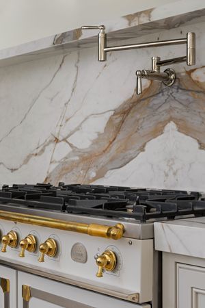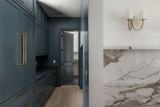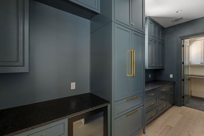 A one-of-a-kind chef’s kitchen centers the space, anchored by a Cornufe 110 gas range, polished nickel Perrin & Rowe Georgian Era fixtures, and sleek push-to-open cabinetry. A full butler’s pantry, complete with a built-in refrigerator, Zephyr dual-zone wine cooler, and expansive food storage and prep zones, keeps your main kitchen visually clean and ready for hosting. Every cabinet was thoughtfully designed, with integrated trash pull-outs, utensil dividers, and concealed organization.