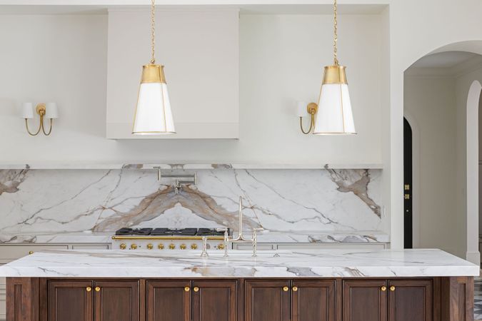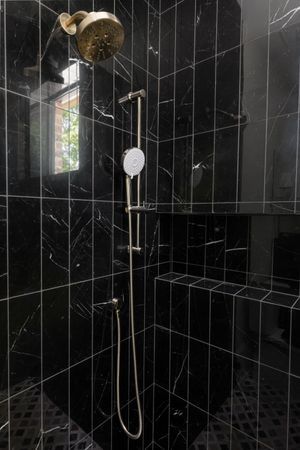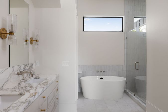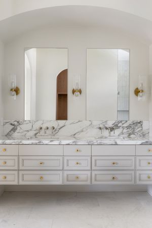 The main-floor primary suite is the epitome of understated elegance. Framed by tranquil pool views, the space features antique gold Rohl fixtures, a freestanding soaking tub, and honed Calacatta Gold and Bardiglio marble floors. A custom-designed vanity and brass-framed reeded glass doors add a refined, tailored finish.