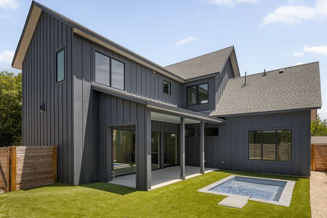 Step outside to a covered porch that opens onto a private turf backyard and serene pool—an ideal setting for morning coffee, weekend lounging, or sunset dinners. An eight-foot privacy fence encloses the space, while soffit downlighting and step illumination create a warm glow long after the sun goes down.