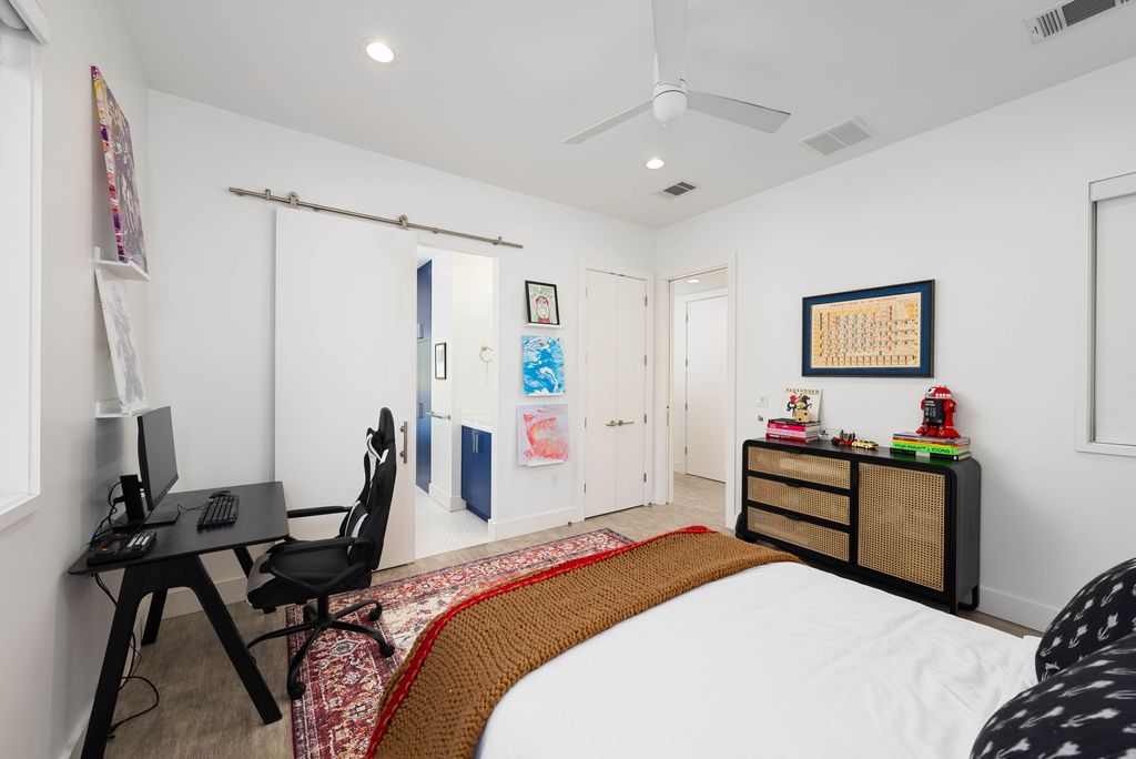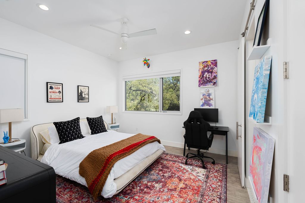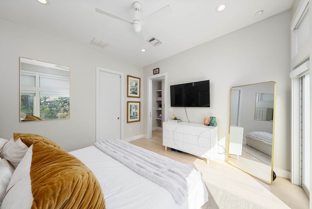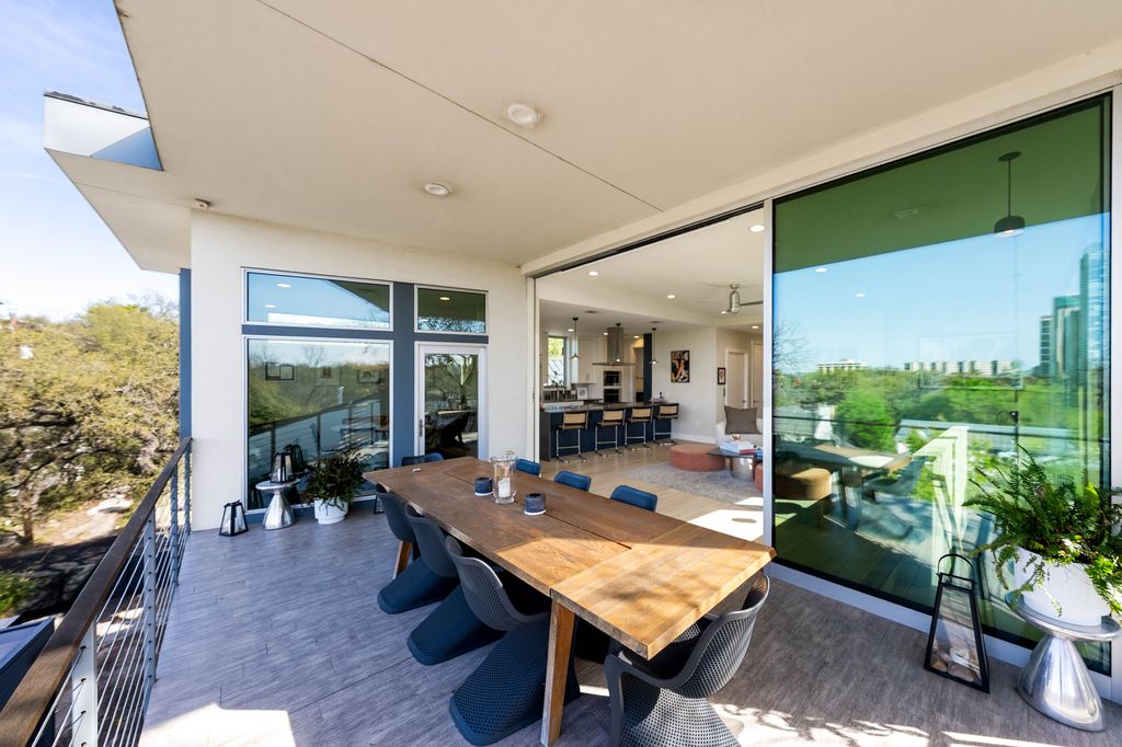 At the top, the heart of the home reveals itself. A 13-foot quartz island grounds the open-concept kitchen, surrounded by custom cabinetry and top-of-the-line Wolf and Sub-Zero appliances. Multi-slider glass doors open to a generous covered outdoor dining area, where sweeping views of Lady Bird Lake and the downtown Austin skyline stretch out before you—an unforgettable backdrop that shifts from vibrant cityscape by day to twinkling lights by night. The primary suite is intentionally positioned for privacy, separated from the rest of the home to create a true retreat. Wake up to canopy-level views and take in the pool’s reflection just outside your window—an experience that feels more like a boutique hideaway than a residence minutes from downtown.