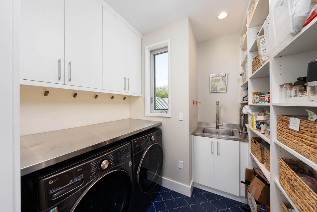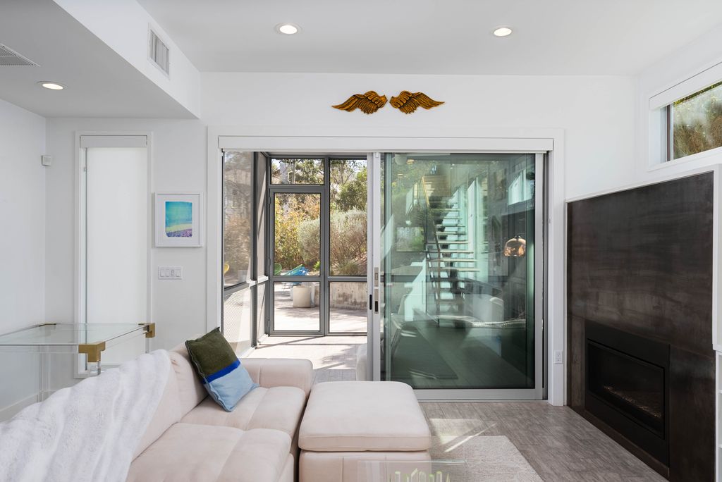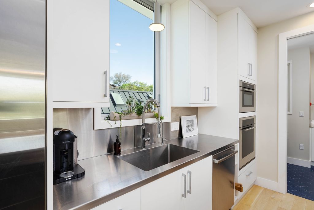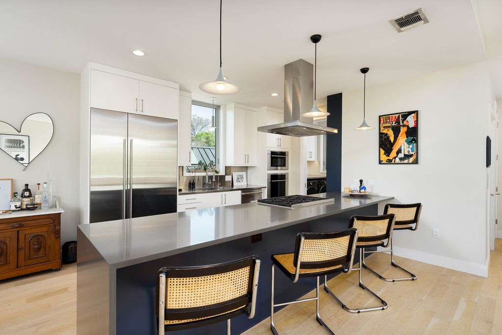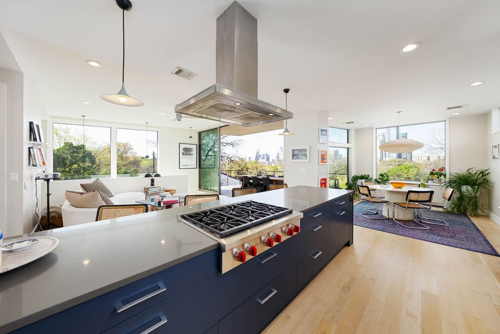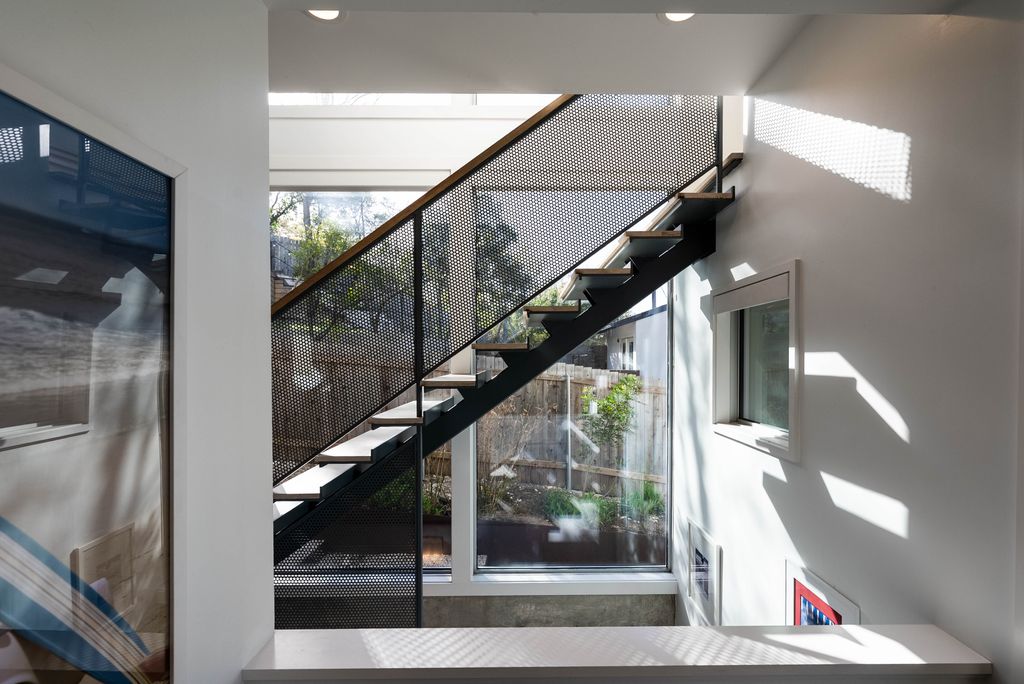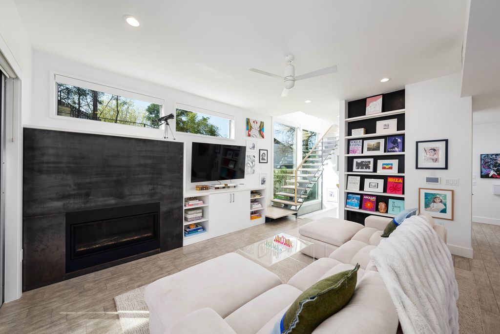 From the moment you arrive, the home reveals itself in layers. A sculptural staircase traces the steel retaining wall and leads you up the natural ridge to a shaded front terrace. Inside, a bold steel-framed staircase anchors the interior, rising through all three levels and filtering light through expansive west-facing windows. Wide-plank five-inch white oak floors bring warmth throughout, while an elevator ensures ease and accessibility on every level.