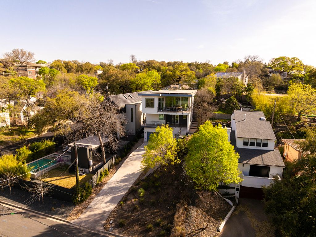 Perched above the street on a quiet hillside in the heart of Travis Heights, this architecturally significant single family residence delivers a rare blend of bold design, privacy, and walkable urban living. Designed by the acclaimed Merzbau Design Collective and brought to life by Melde Construction, the home seamlessly offers a one-of-a-kind living experience—downtown skyline views, treetop serenity, and thoughtful sustainability.